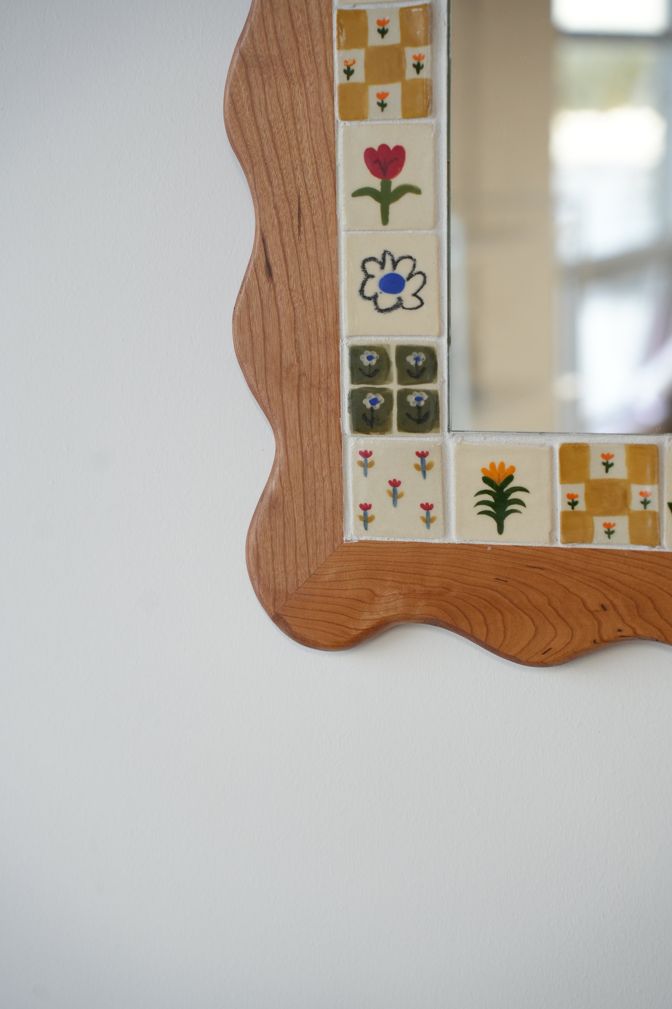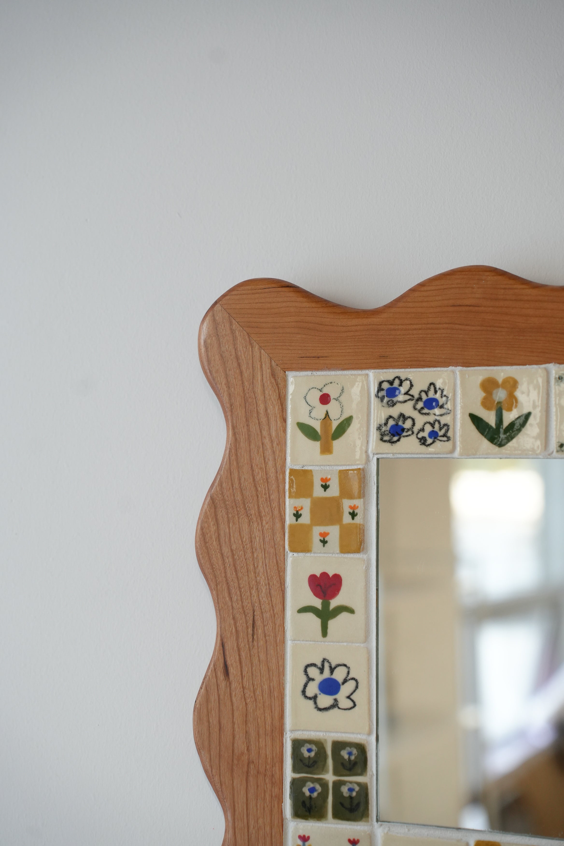 From the perfectly smooth corners to the little flowers, our wood and ceramic mirrors are made completely by hand. Handmade and painted tiles are inlayed in to expertly crafted wooden frames, made from sustainably sourced Canadian hardwood, a beautiful contrast of texture and colour. Each one is made here in our Toronto studio in collaboration with local wood worker Tamsin Kelsey, and is the result of many many hours of love and labour.