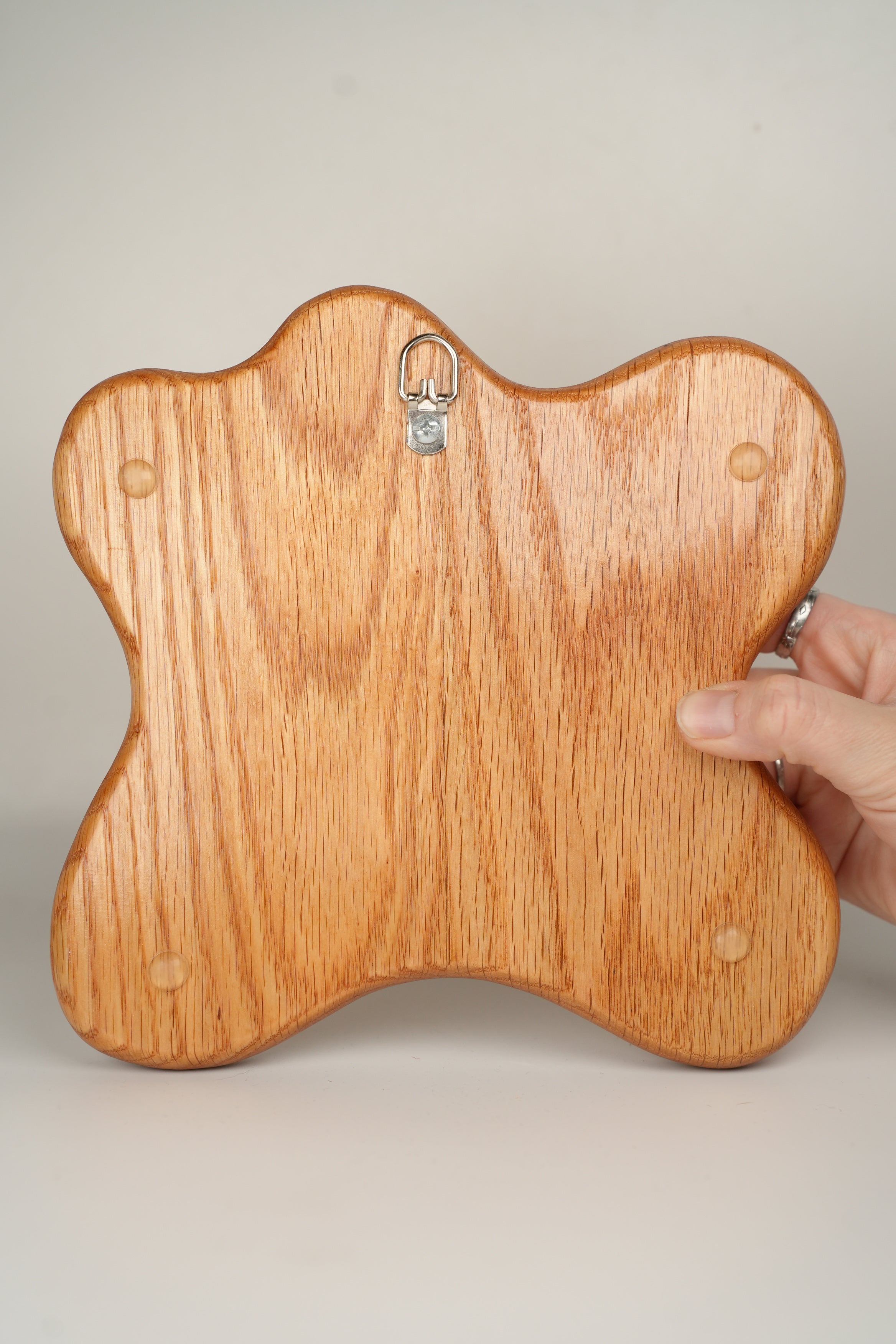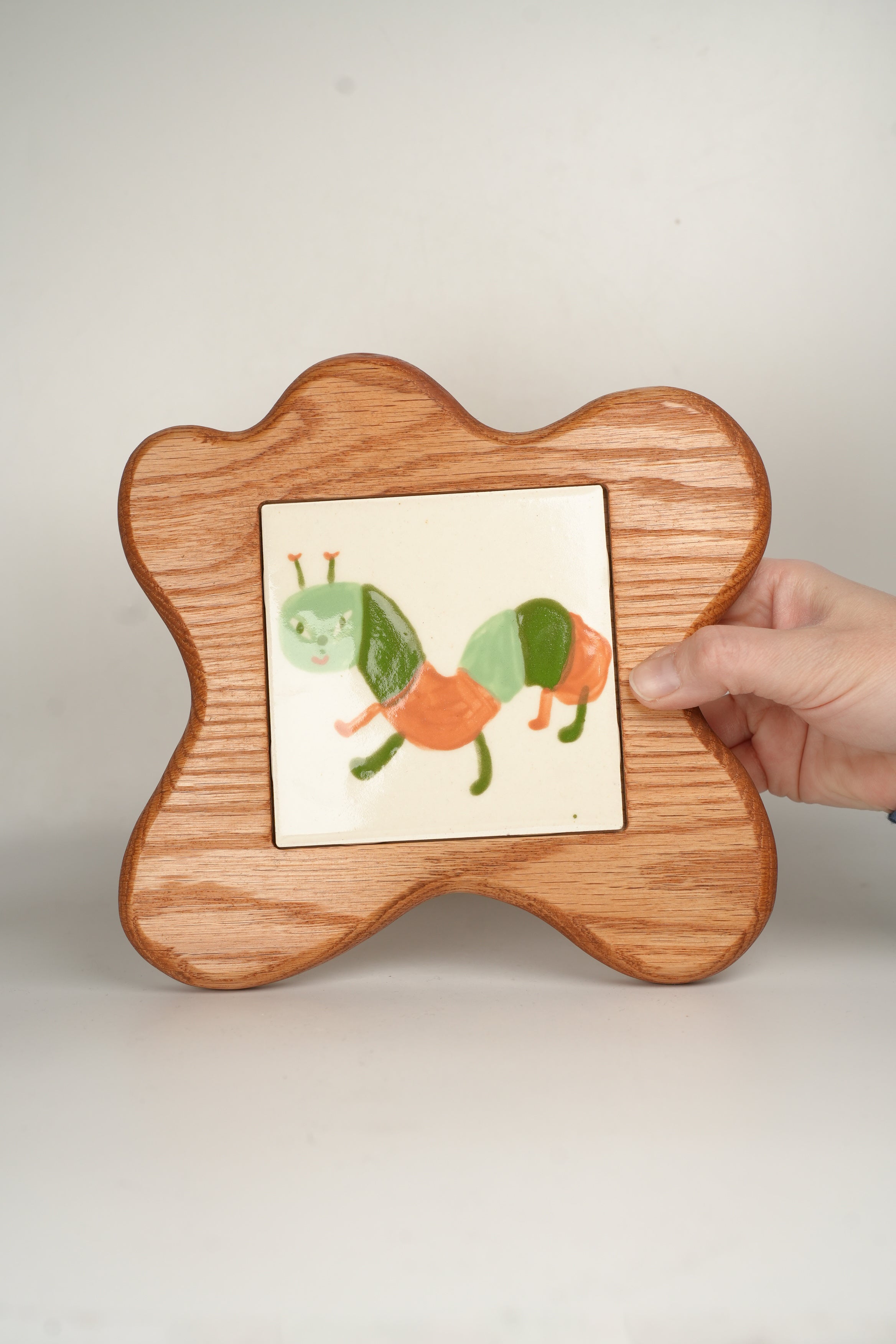 A handmade trivet with an inset tile. Created with sustainably sourced, Canadian hardwood. These can be used as a hot plate for dining, or more decoratively by hanging on a wall. Made in collaboration with local woodworker Tamsin Kelsey.