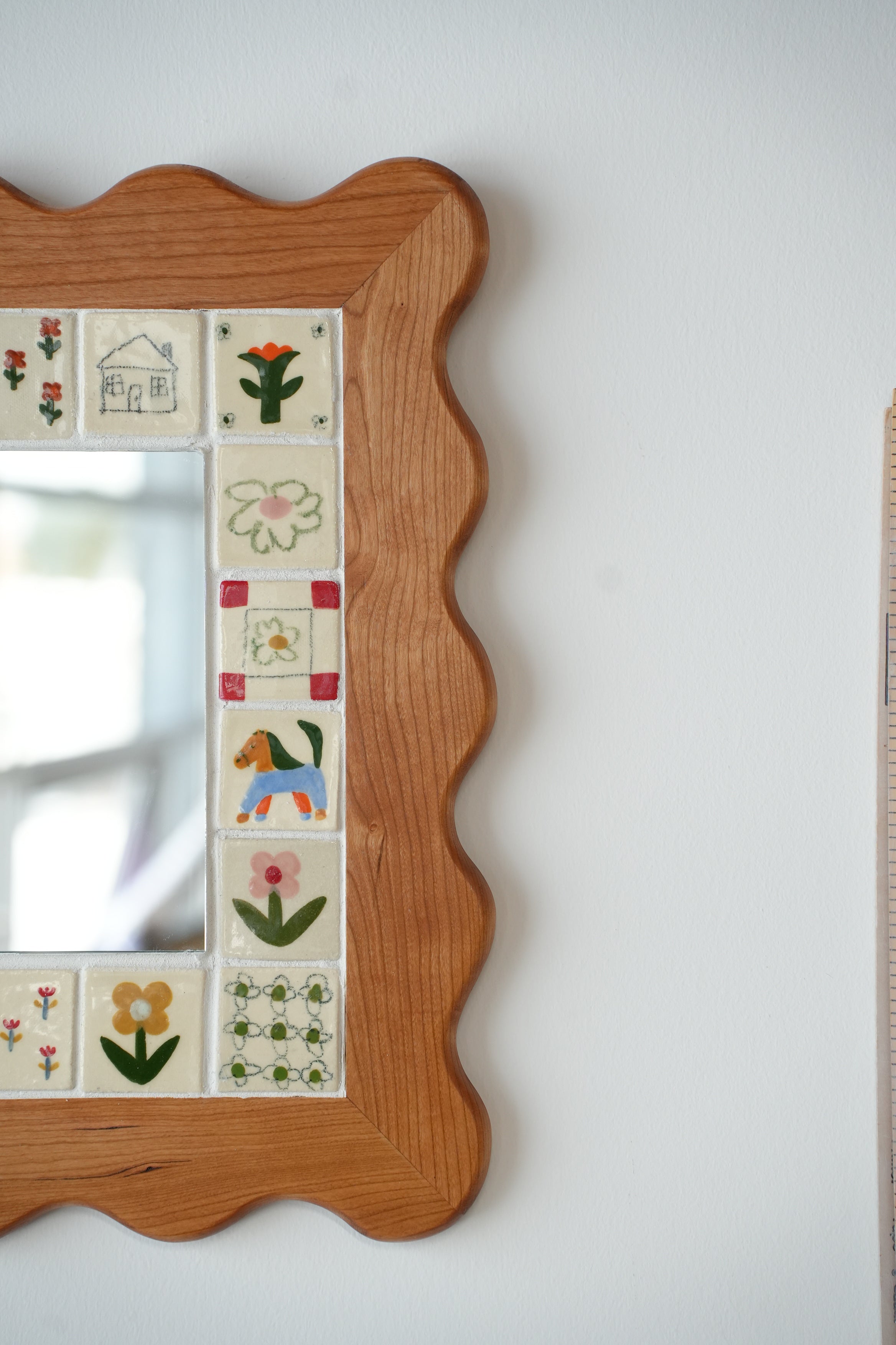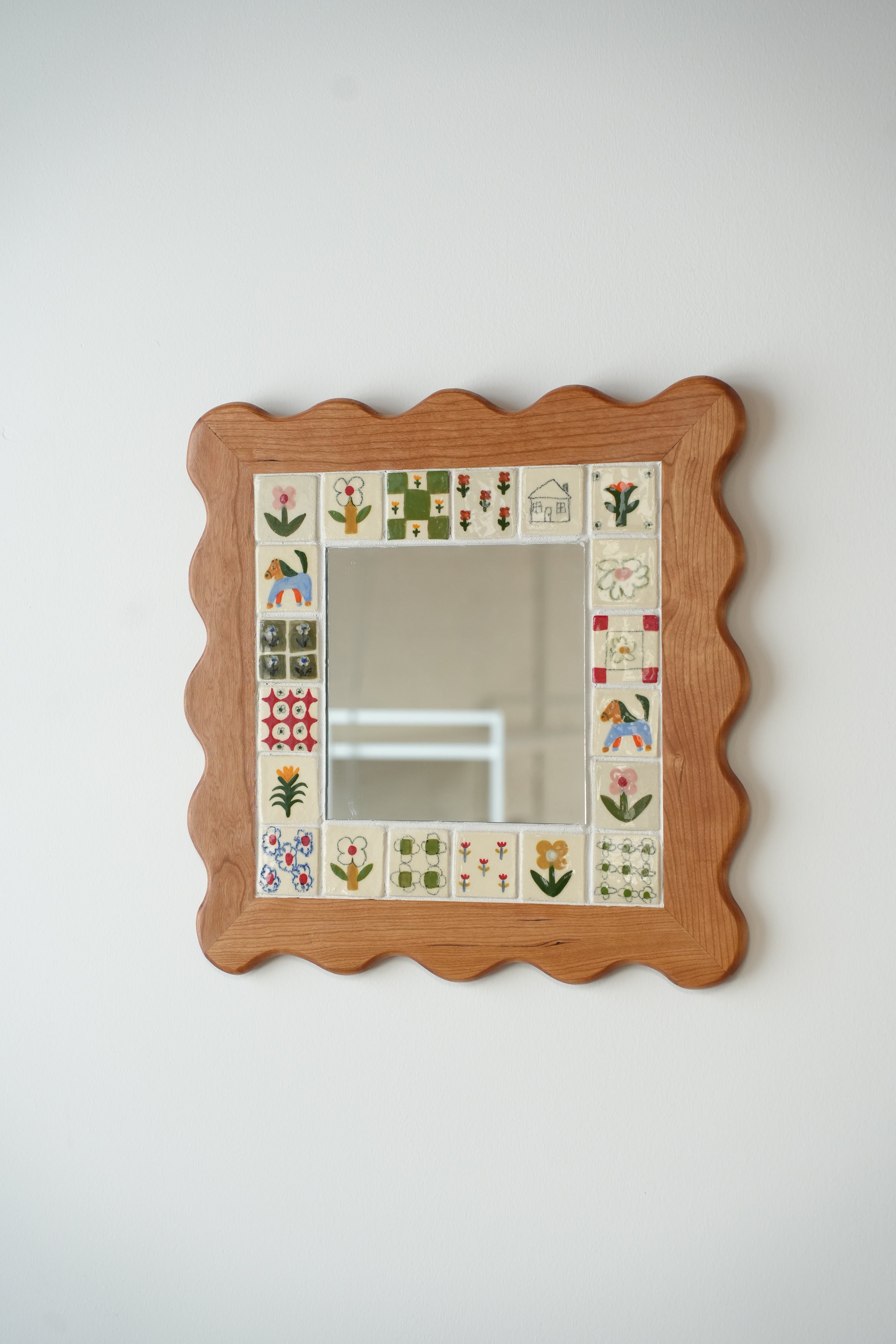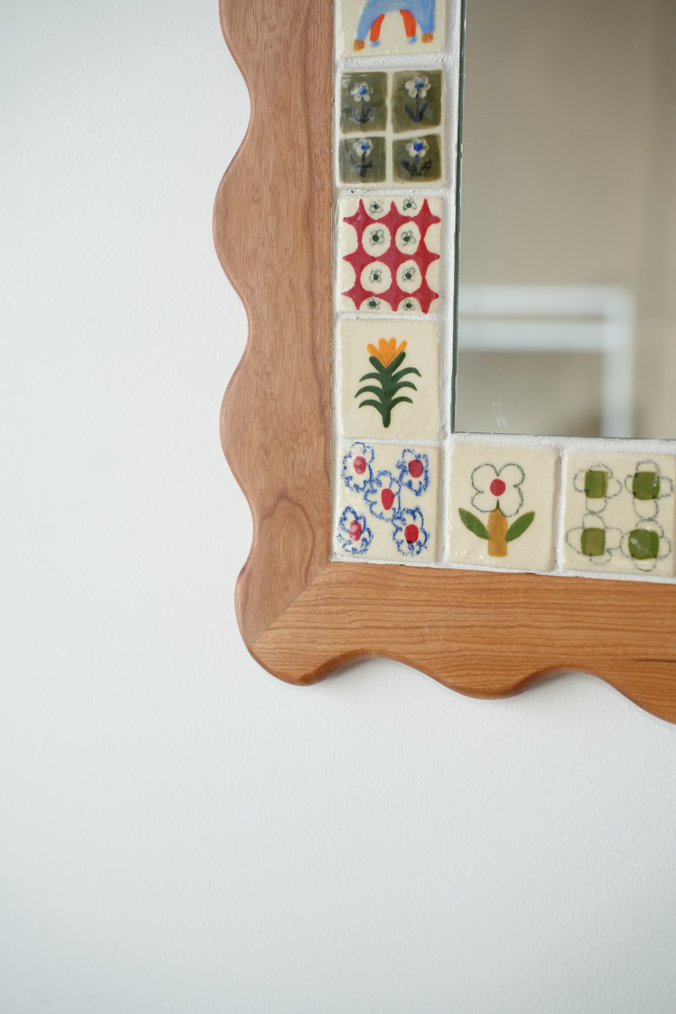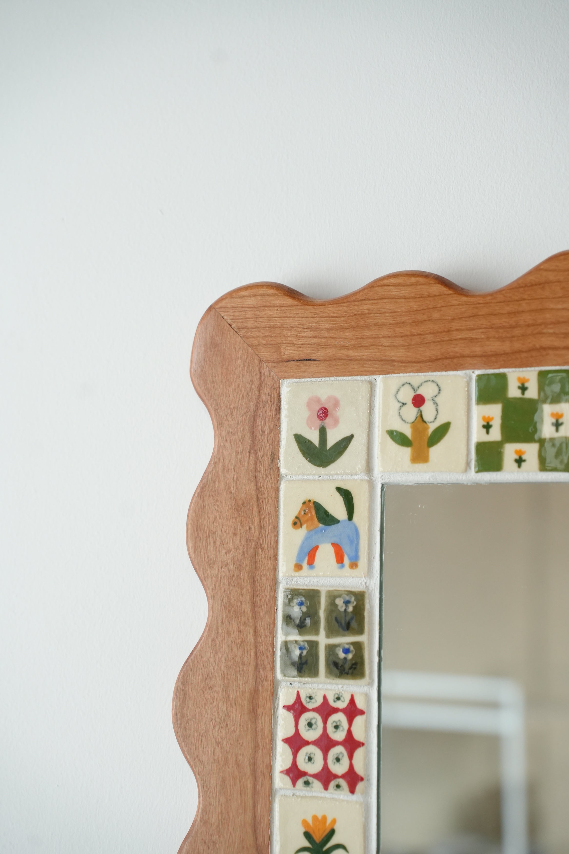 From the perfectly smooth corners to the little flowers, our wood and ceramic mirrors are made completely by hand. Handmade and painted tiles are inlayed in to expertly crafted wooden frames, made from sustainably sourced Canadian hardwood, a beautiful contrast of texture and colour. Each one is made here in our Toronto studio in collaboration with local wood worker Tamsin Kelsey, and is the result of many many hours of love and labour.
