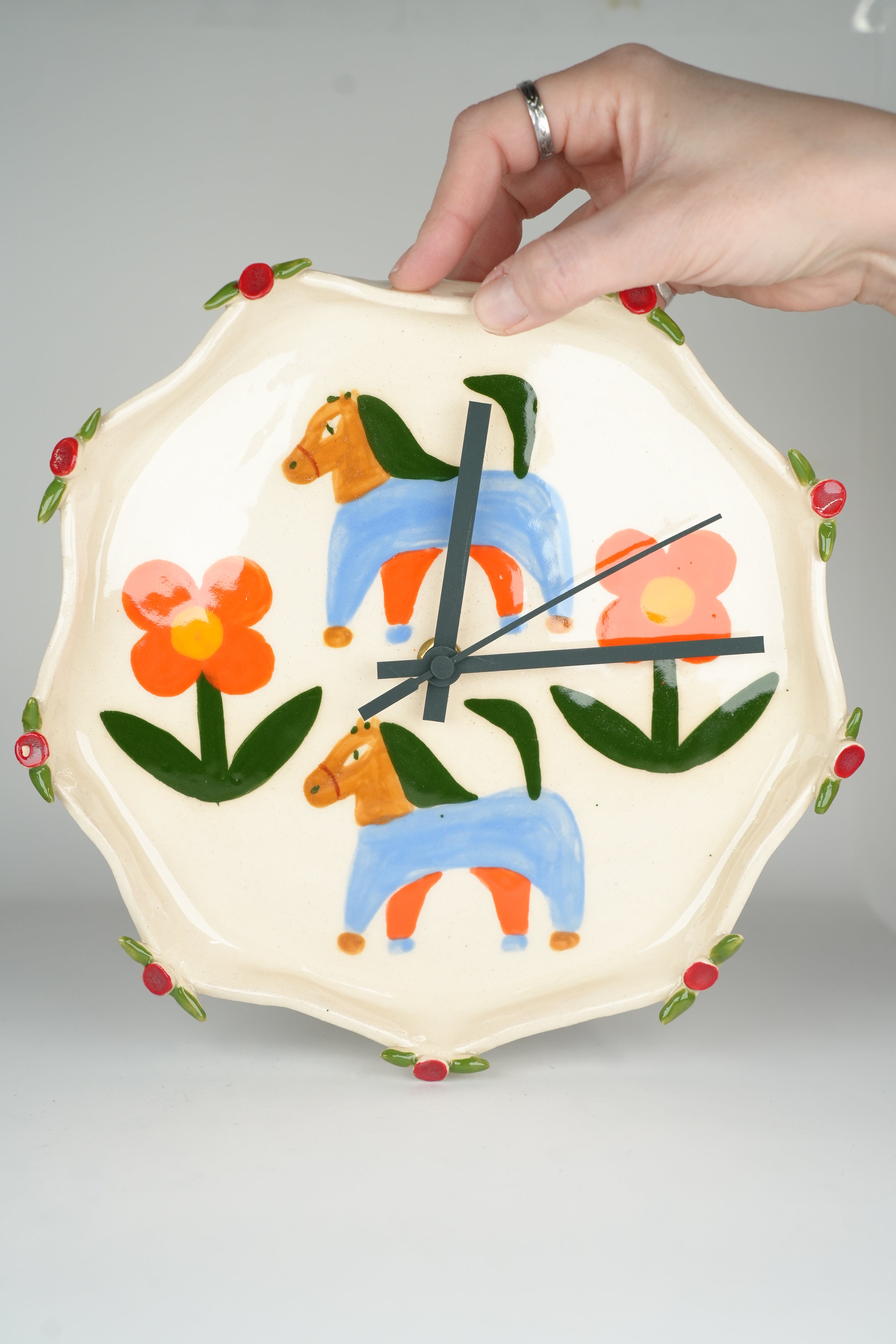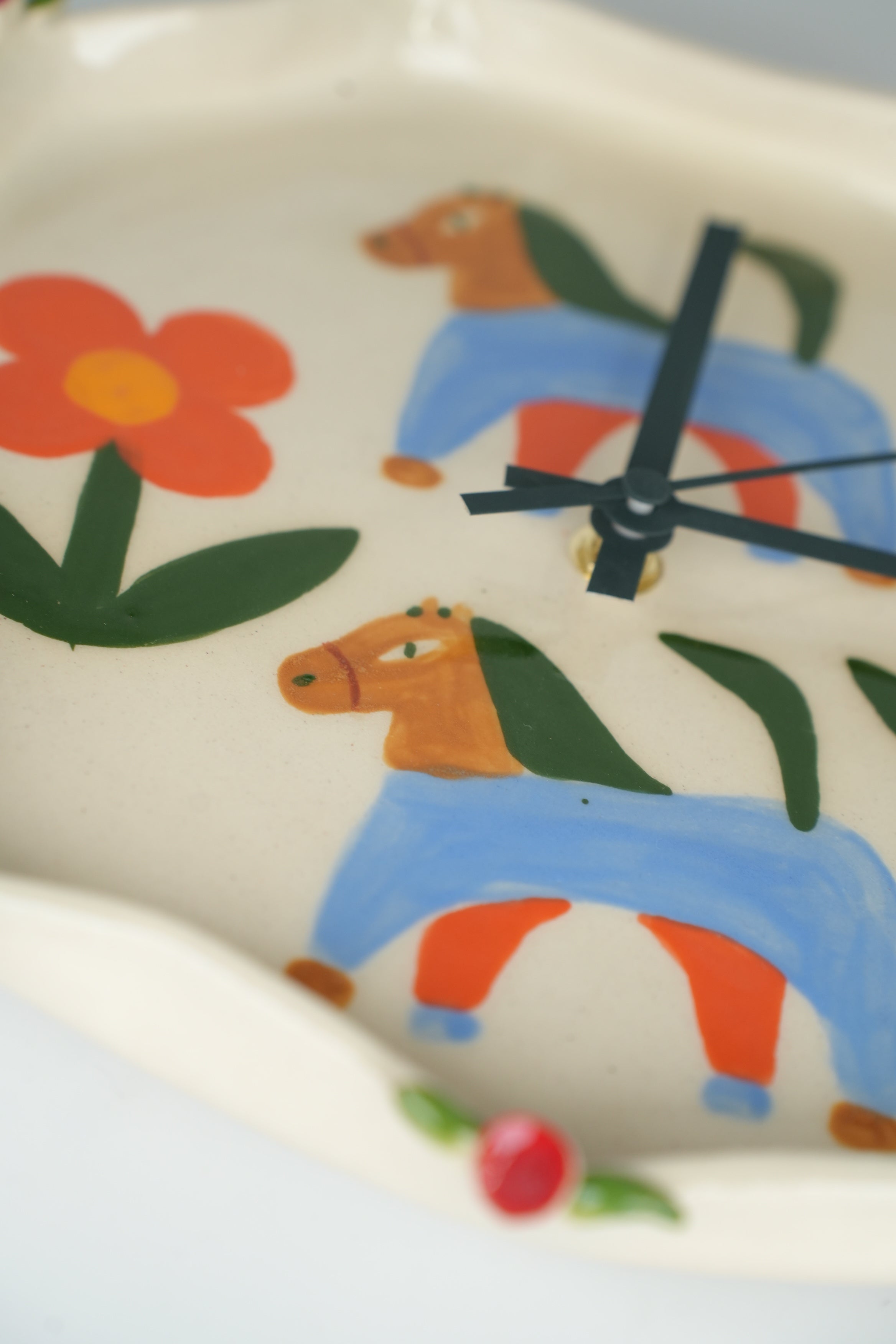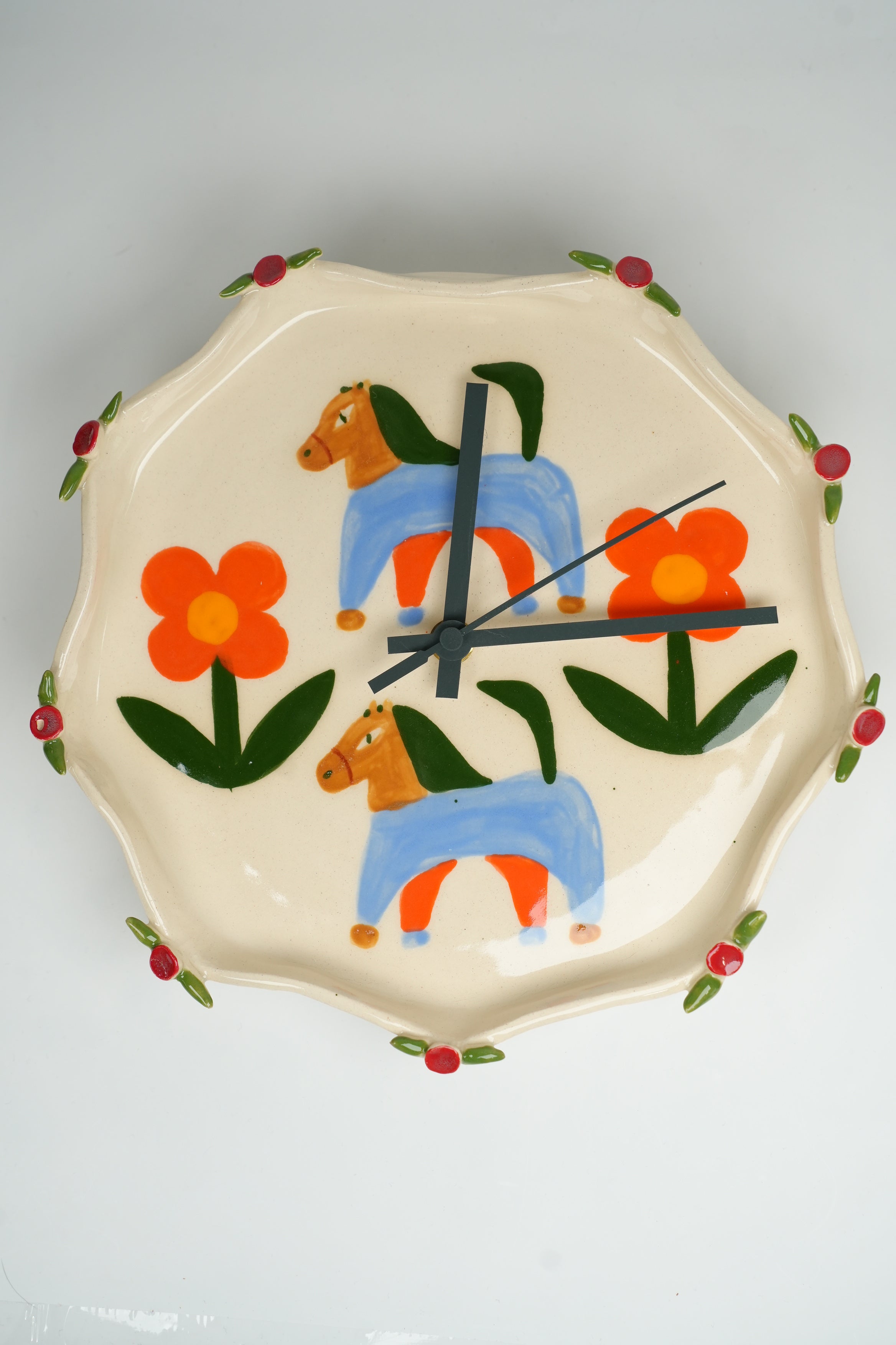 Tick tock, a ceramic clock! (The motors are silent, so there isn't actually any tick tocking.) A step on our mission to make the mundane beautiful. A true embodiment of our belief that art can be functional, these clocks are great for telling time and even better for looking beautiful on your wall. Painstakingly crafted one by one, each of these clocks takes days, sometimes weeks to complete. Made and painted by hand in our Toronto studio.