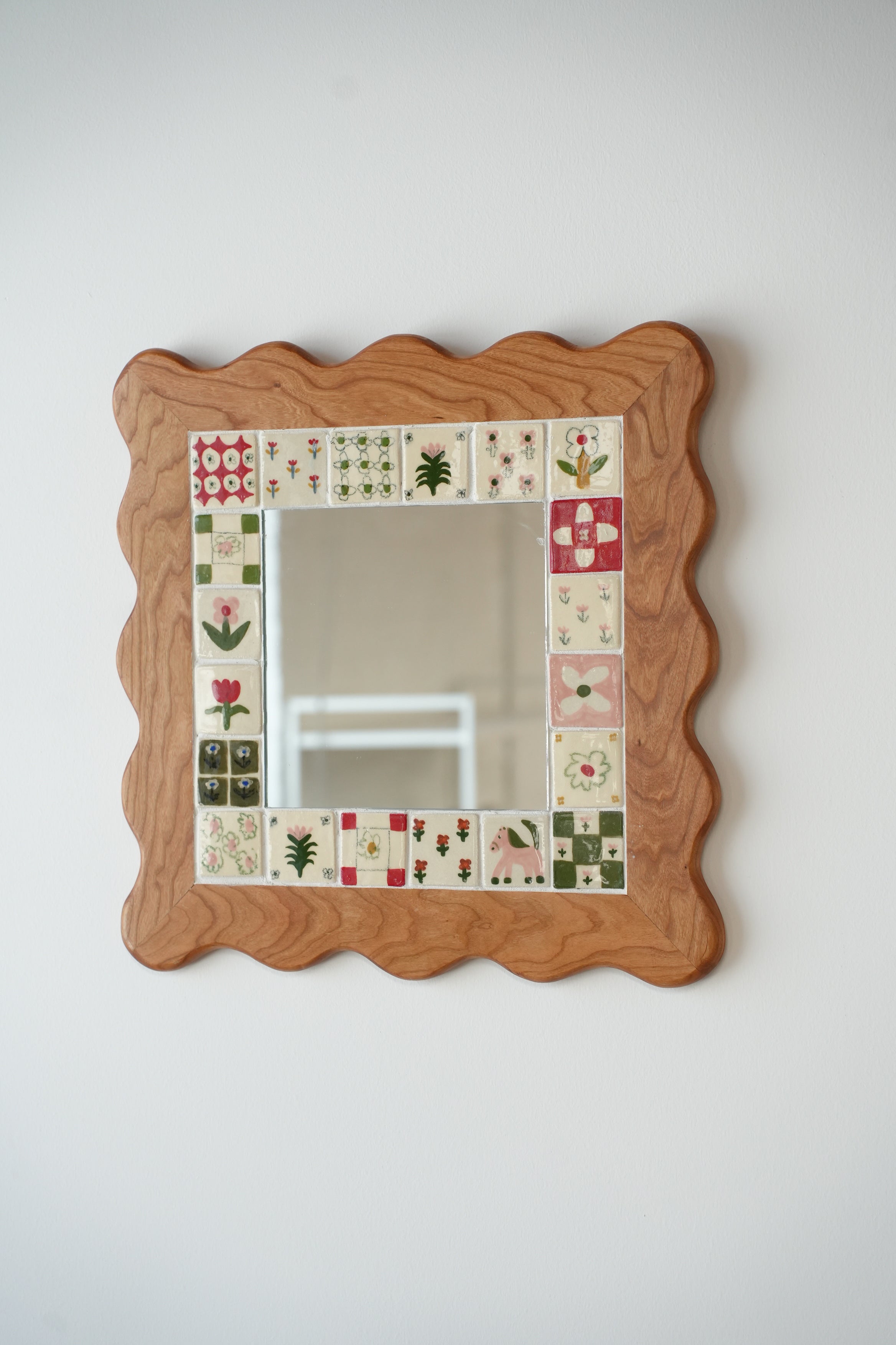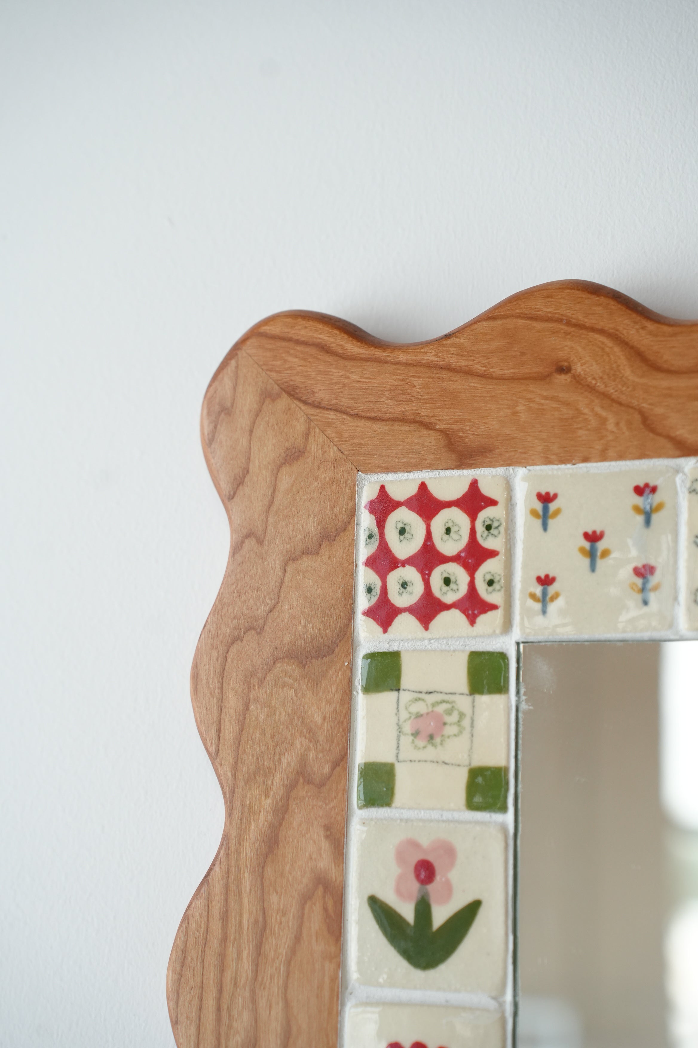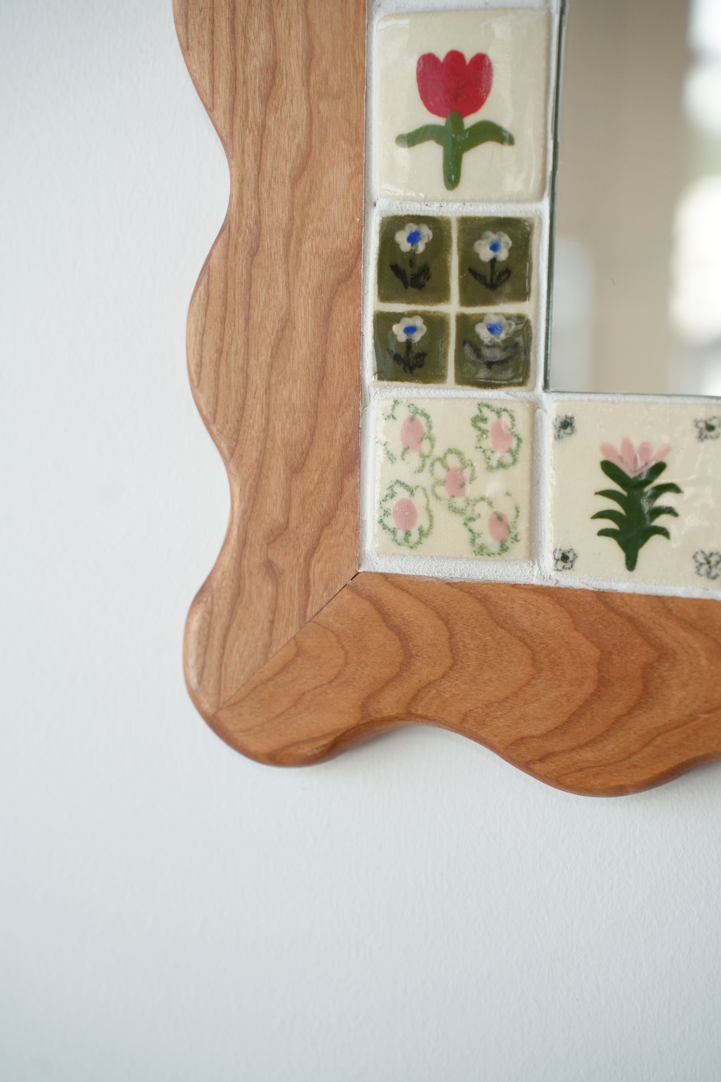 From the perfectly smooth corners to the little flowers, our wood and ceramic mirrors are made completely by hand. Handmade and painted tiles are inlayed in to expertly crafted wooden frames, made from sustainably sourced Canadian hardwood, a beautiful contrast of texture and colour. Each one is made here in our Toronto studio in collaboration with local wood worker Tamsin Kelsey, and is the result of many many hours of love and labour.
