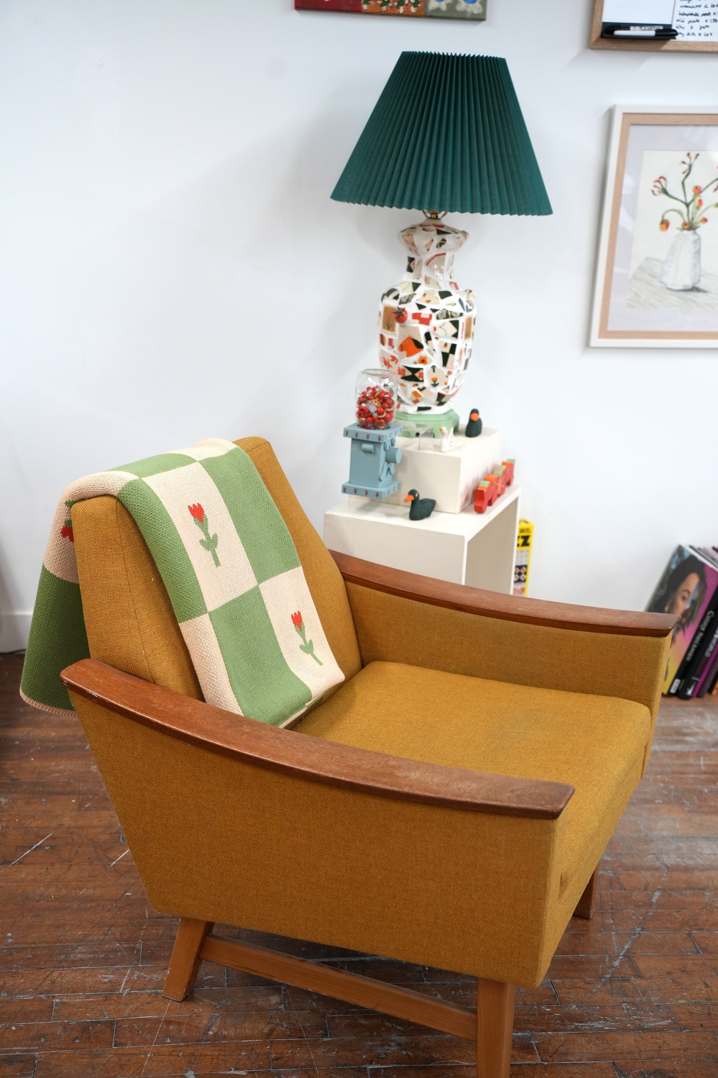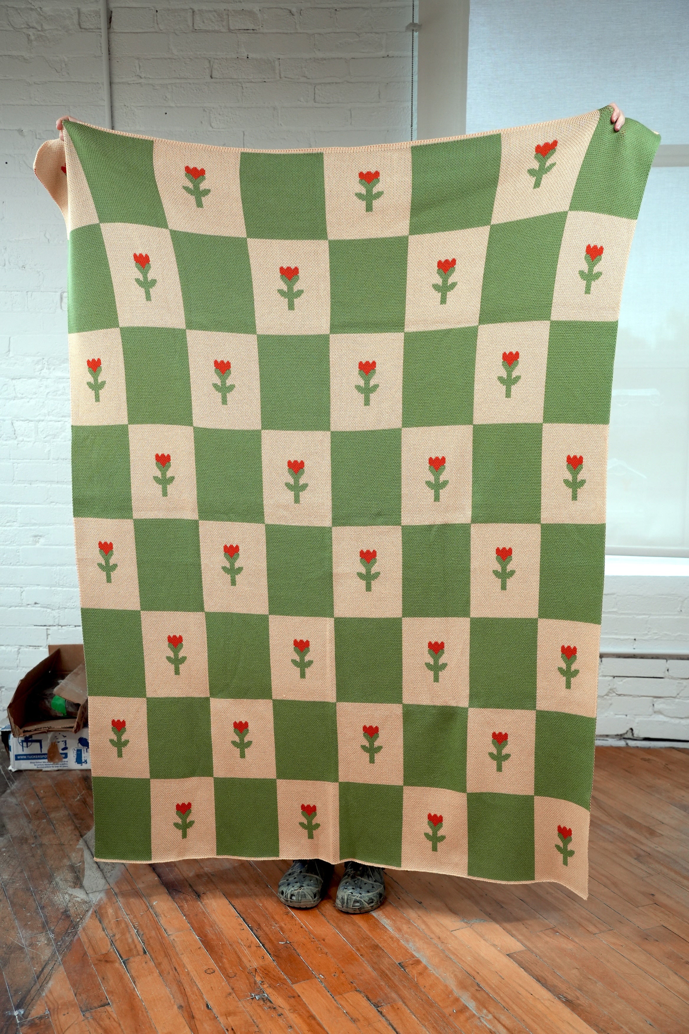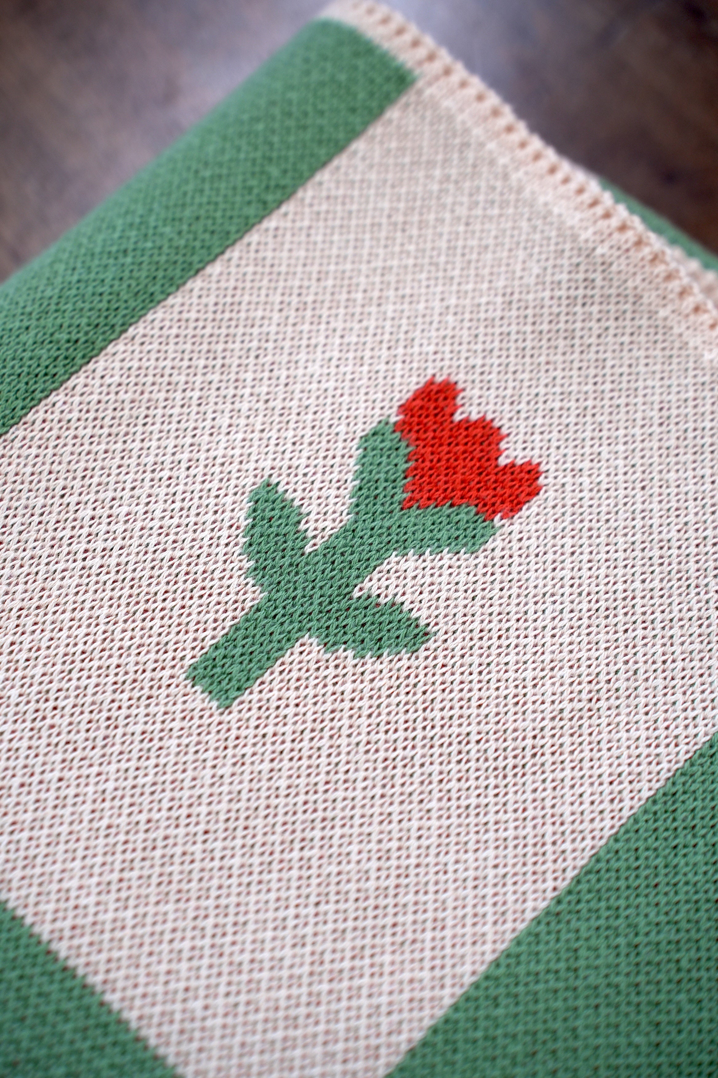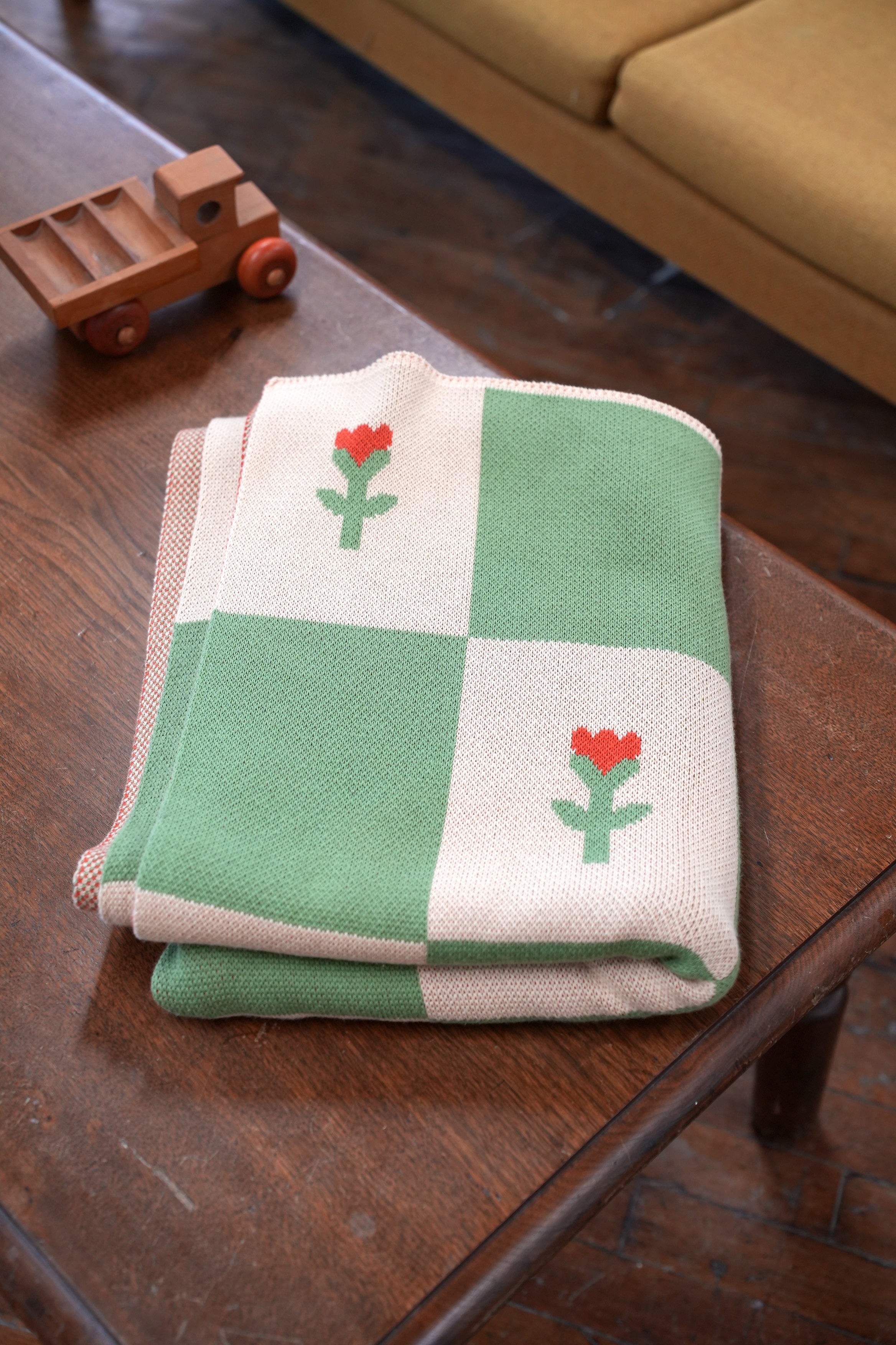 Just in time for fall, The TDF Flower blanket is made from 100% Organic cotton. These substantial, double-knit blankets are the perfect weight for cozying up on the couch, or outside on a crisp fall evening. They're nice and big at 50" x 60", and have a slight amount of stretch.