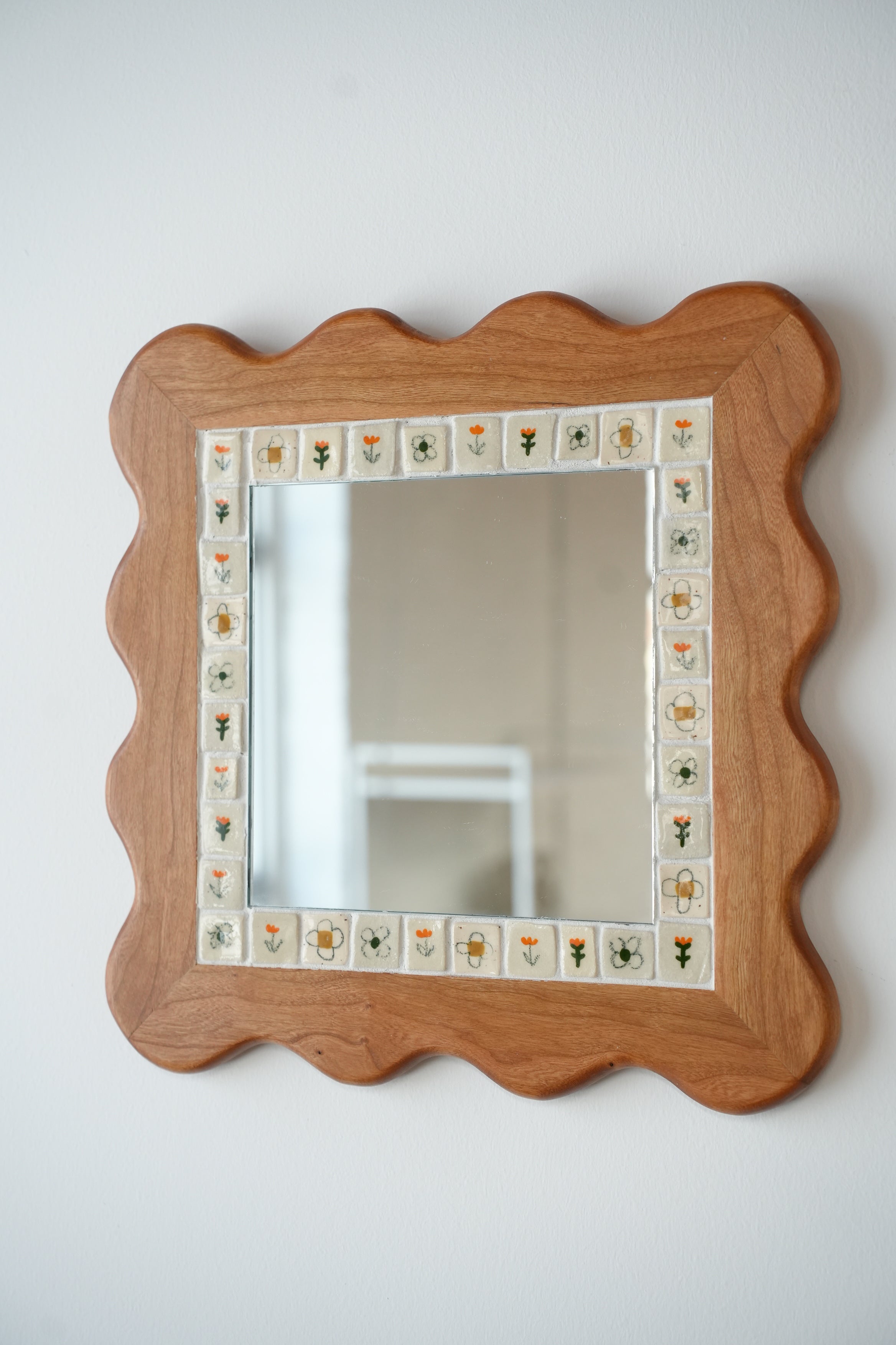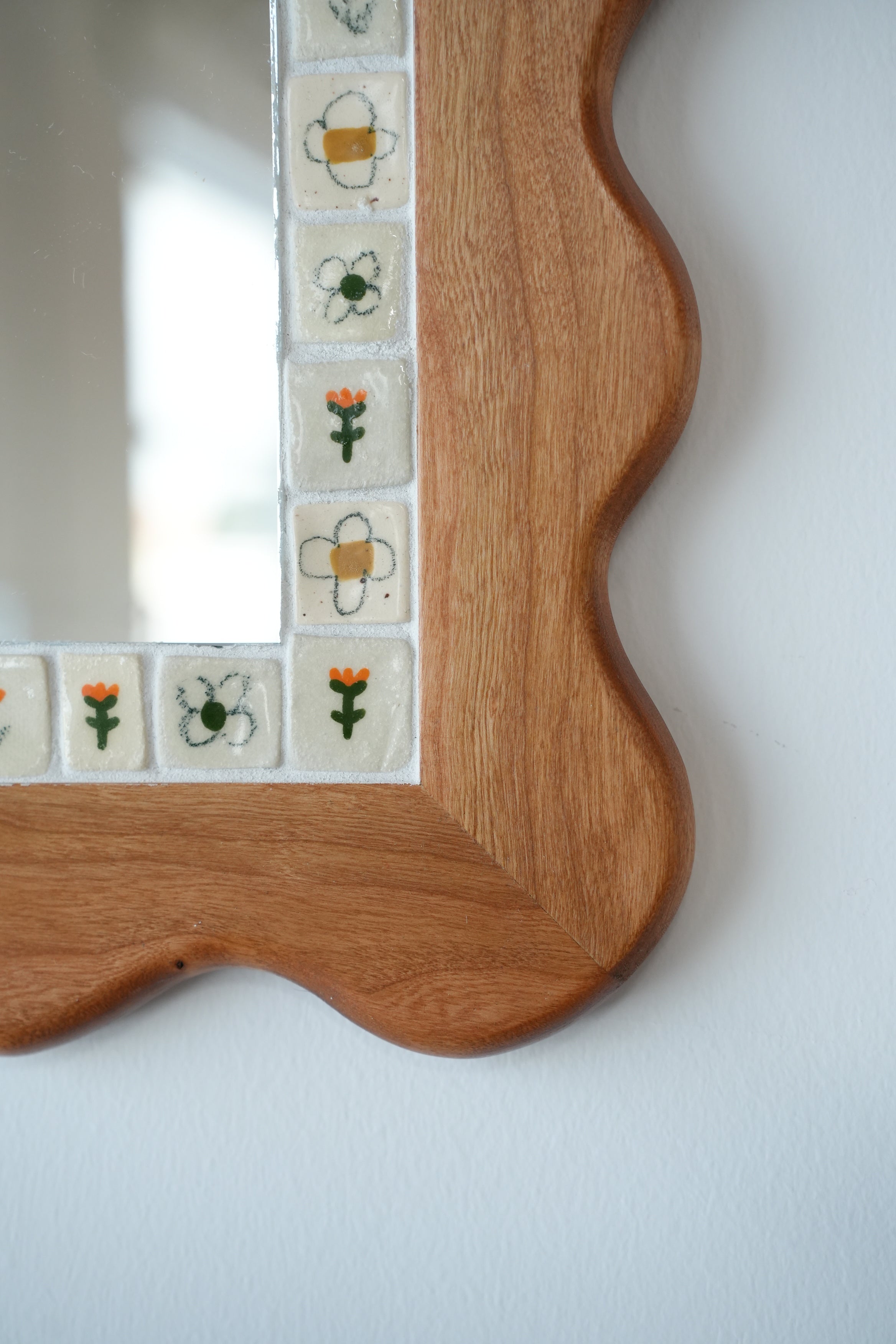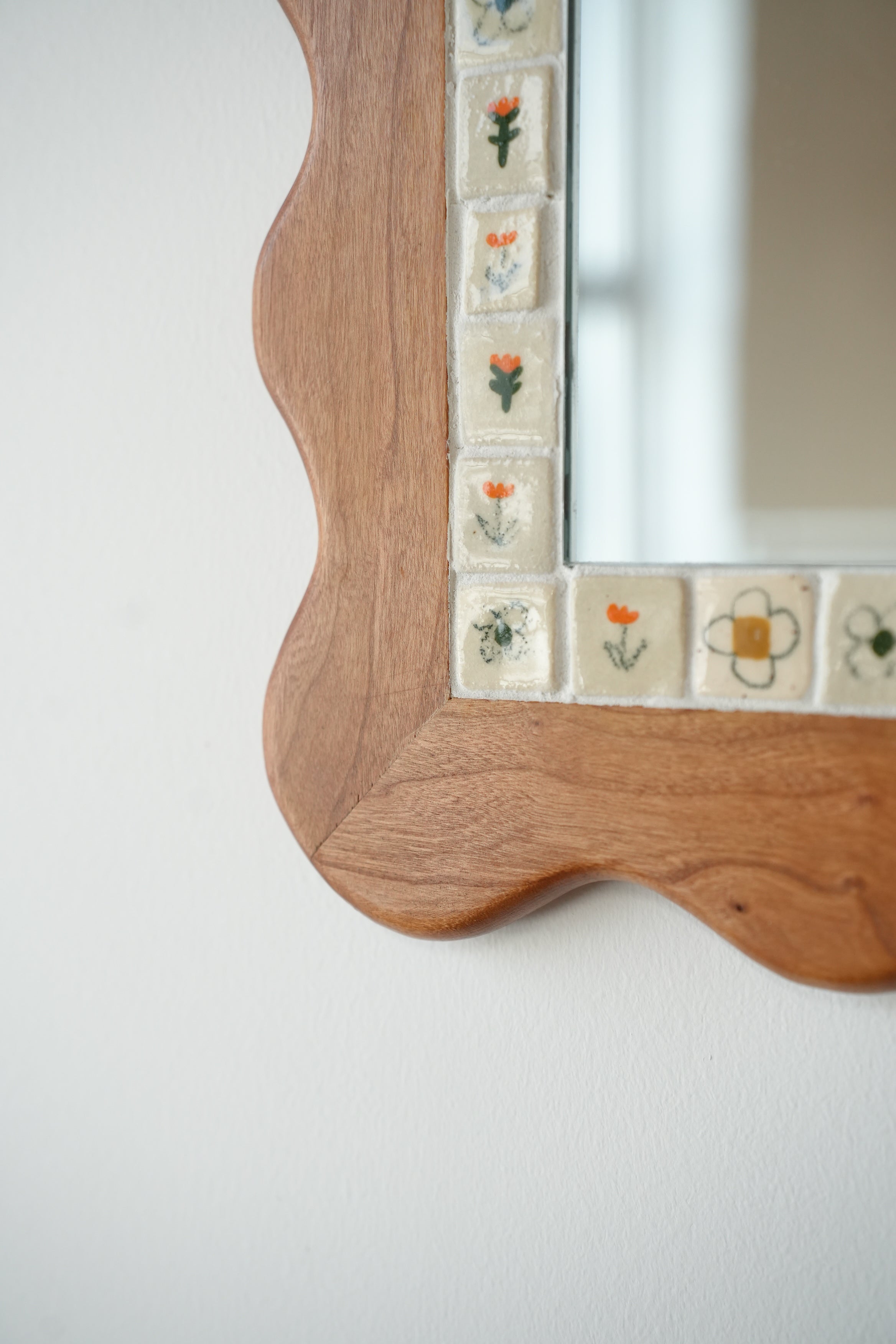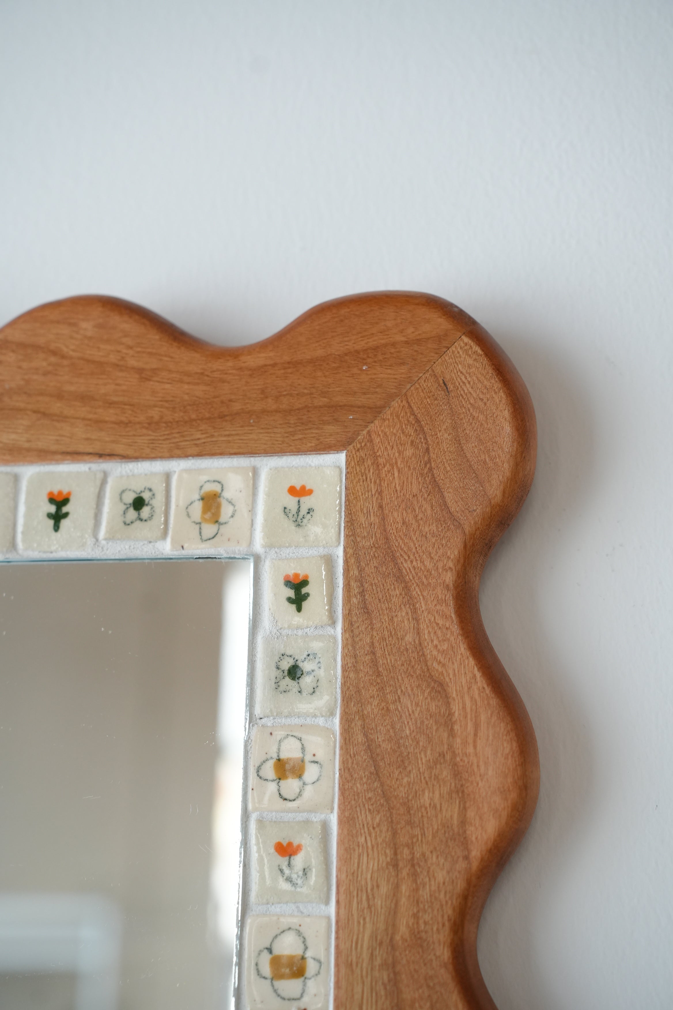From the perfectly smooth corners to the little flowers, our wood and ceramic mirrors are made completely by hand. Handmade and painted tiles are inlayed in to expertly crafted wooden frames, made from sustainably sourced Canadian hardwood, a beautiful contrast of texture and colour. Each one is made here in our Toronto studio in collaboration with local wood worker Tamsin Kelsey, and is the result of many many hours of love and labour.