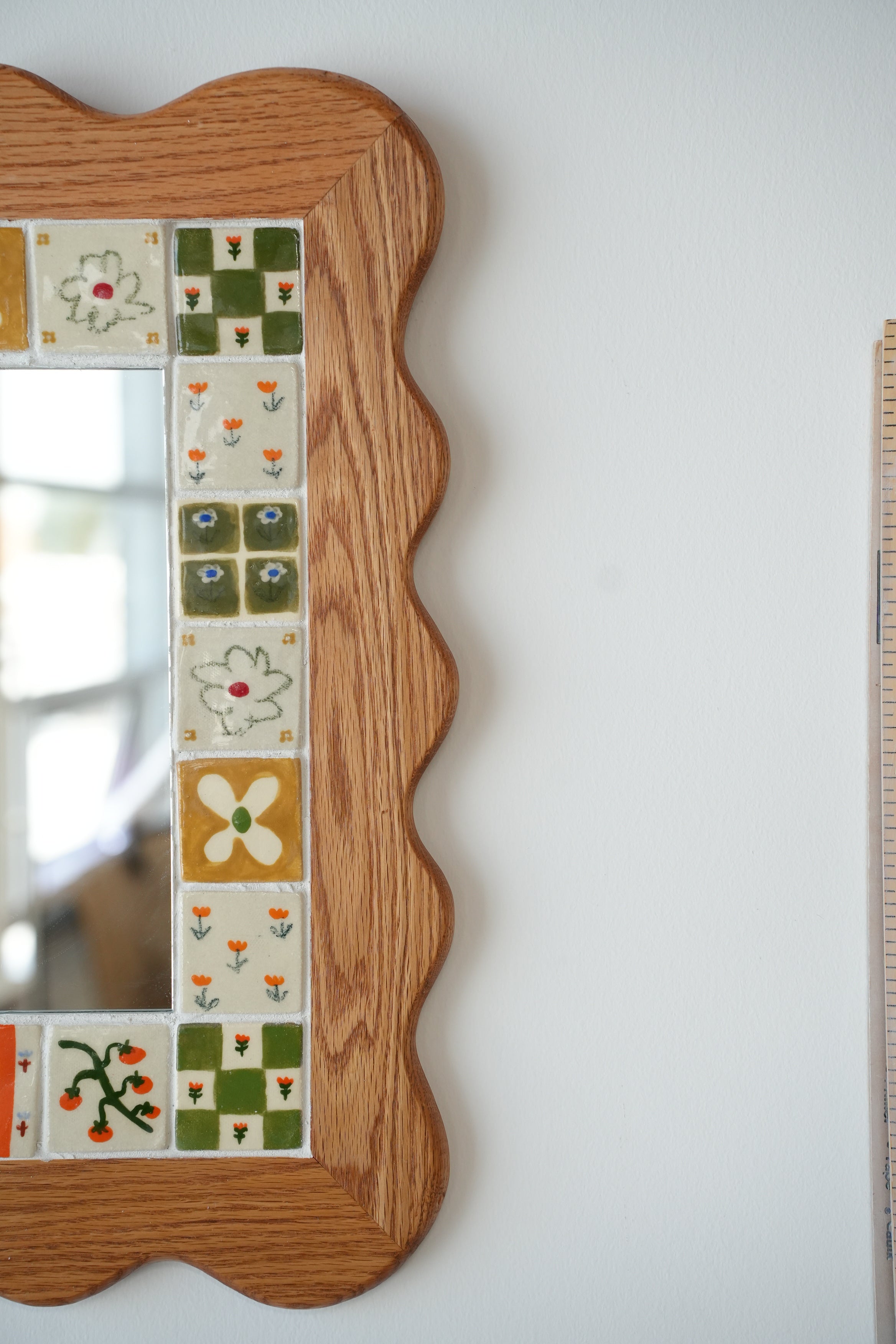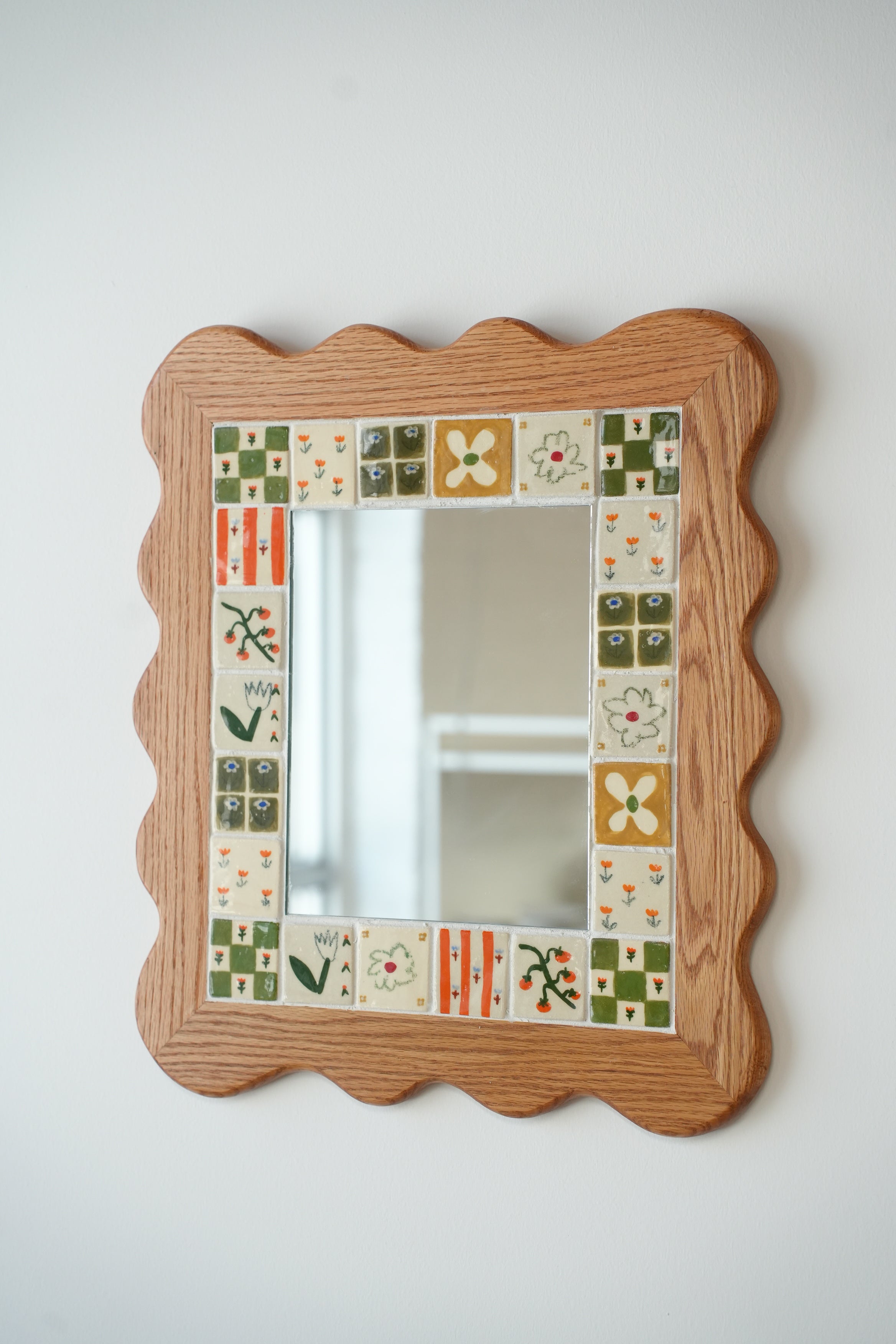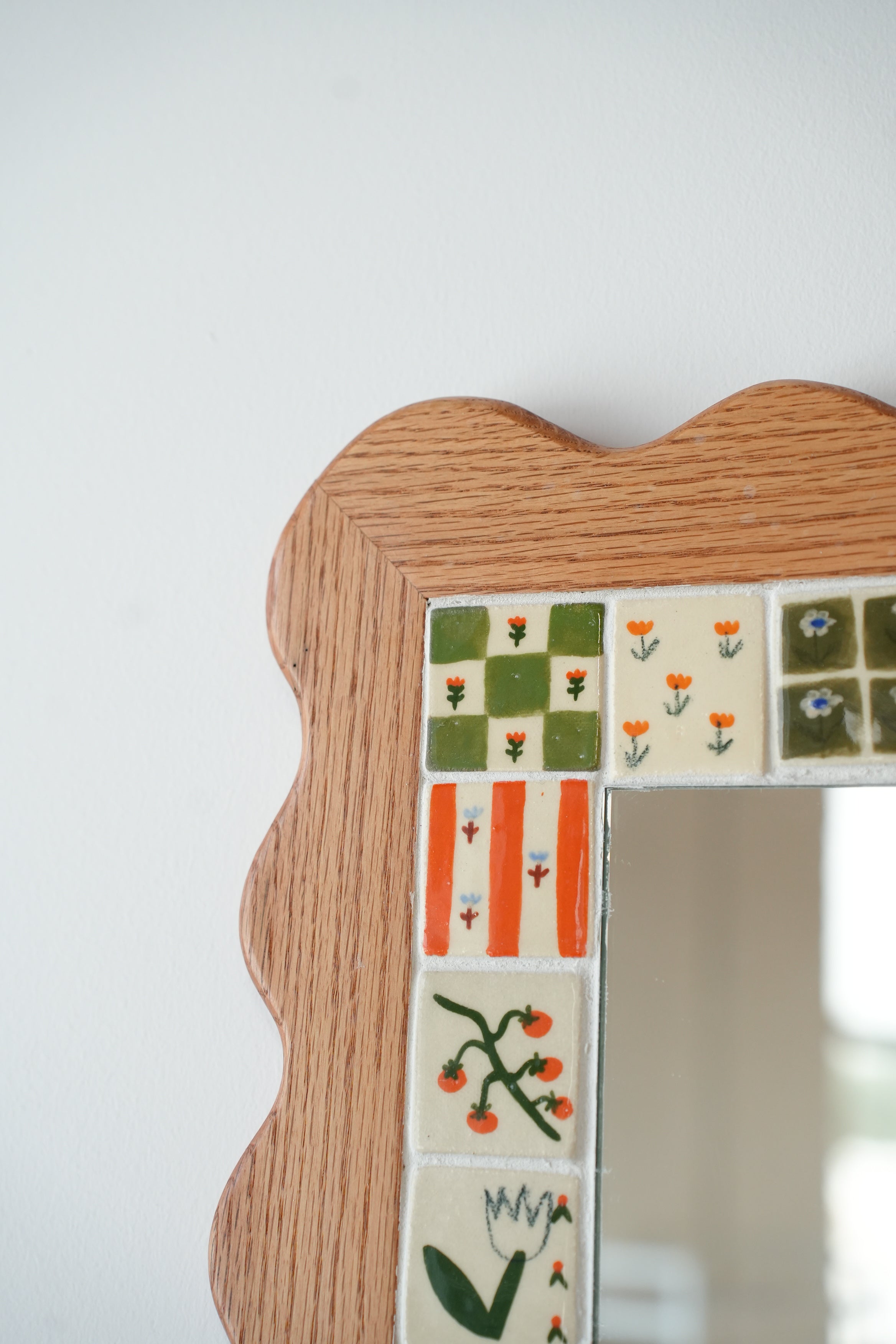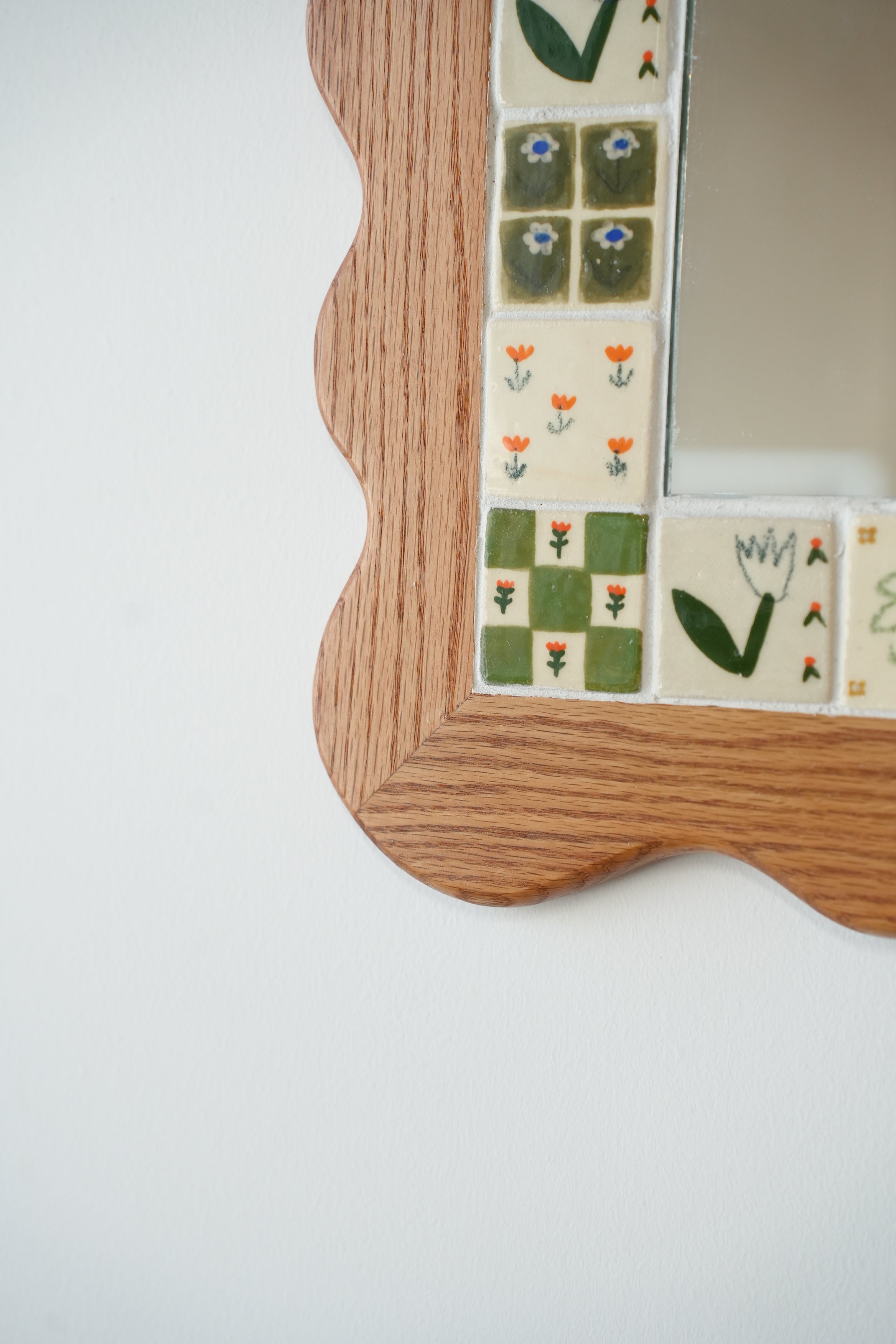 From the perfectly smooth corners to the little flowers, our wood and ceramic mirrors are made completely by hand. Handmade and painted tiles are inlayed in to expertly crafted wooden frames, made from sustainably sourced Canadian hardwood, a beautiful contrast of texture and colour. Each one is made here in our Toronto studio in collaboration with local wood worker Tamsin Kelsey, and is the result of many many hours of love and labour.